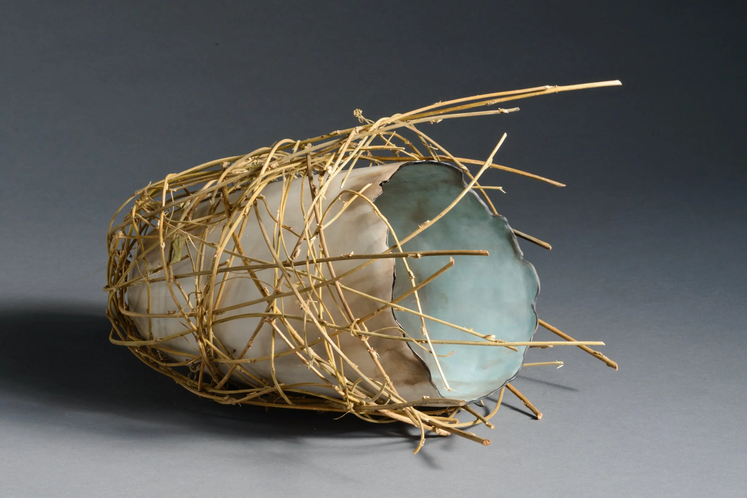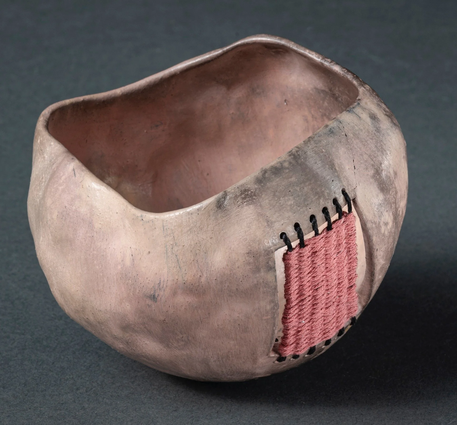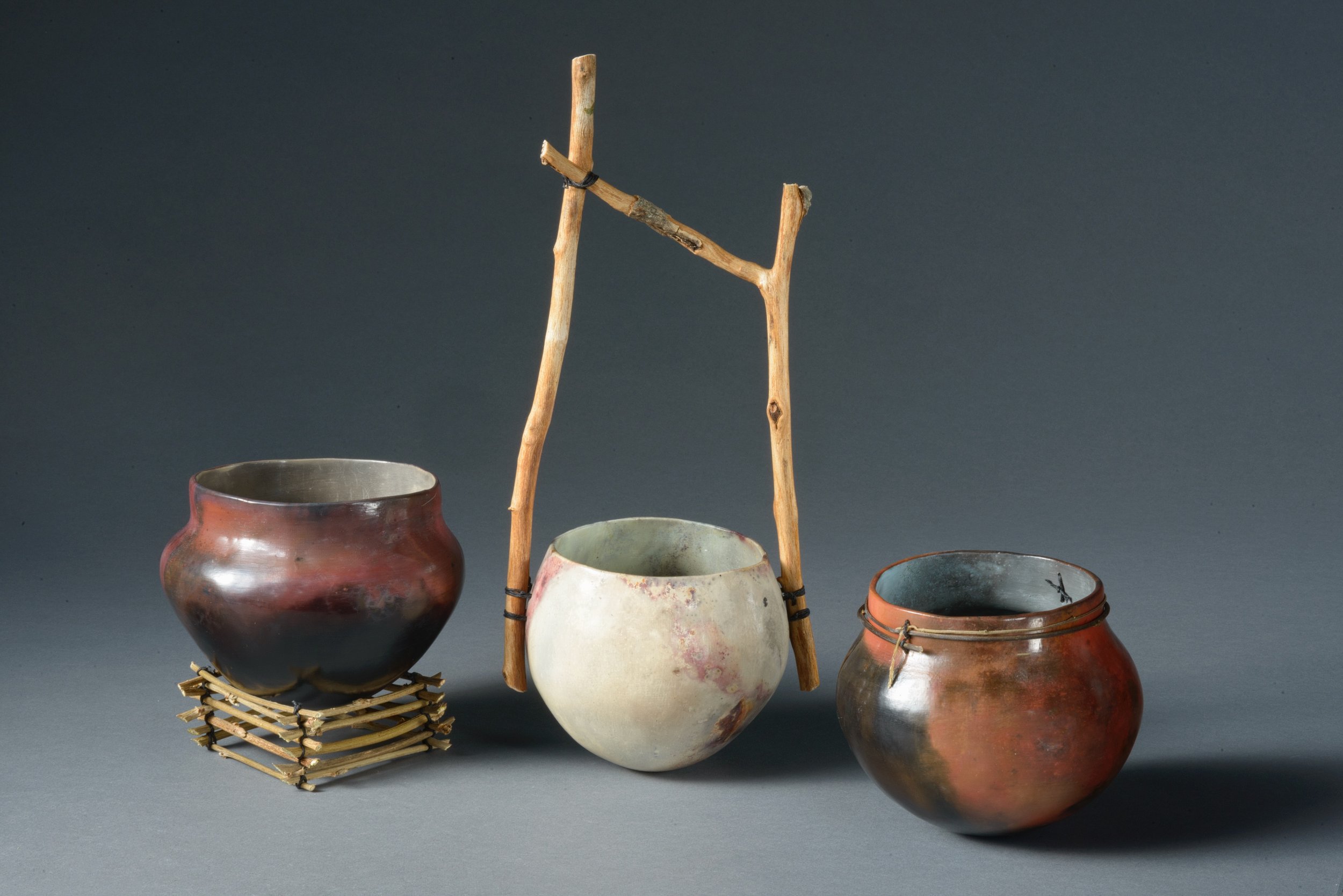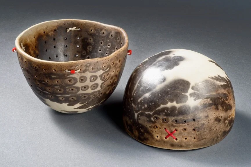 One of my favorite things to make from clay are simple pinched forms. Working a single ball of clay into a finished pot is deeply satisfying and the pot will forever fit and feel wonderful in my hands. Sometimes I join 2 pinch pots to make a closed form that then gets paddled into another shape altogether. I will frequently fire these pots using low-fire, naked (no glaze) techniques - such as pit, obvara, naked raku and saggar firing - after which I may adorn with thread, beading, woven vines, and other found objects.